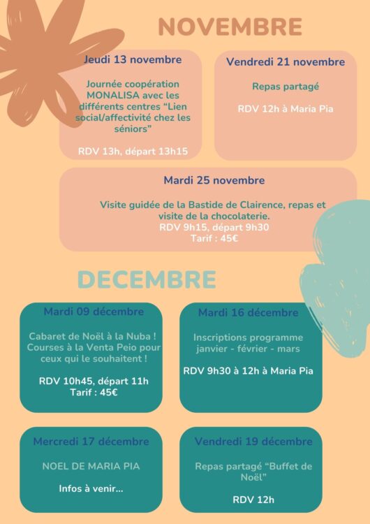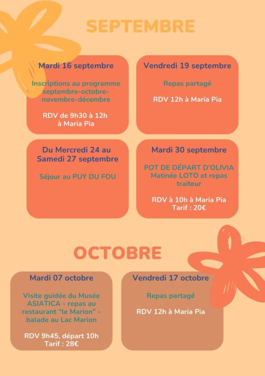 Un programme destiné aux seniors et développé en fonction des demandes. Sorties, repas, ateliers visites ou excursions au gré des envies et des idées.
